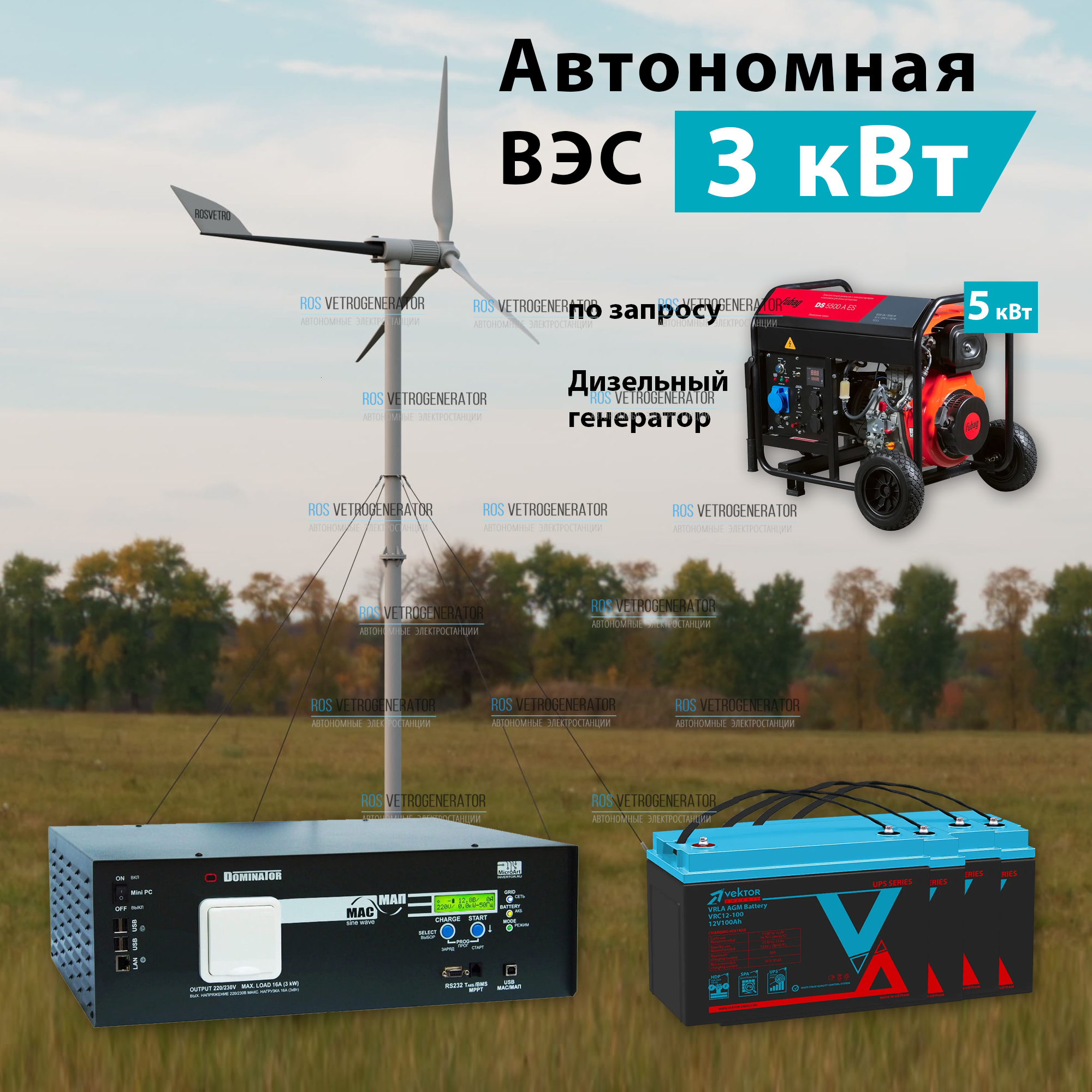 Электростанция ВЭС-3K карбон мощность 3 кВт – это надежный и эффективный способ энергоснабжения практически в любом месте, оснащенная различными компонентами для обеспечения надежного и эффективного электропитания в условиях переменных обстоятельств. Этот тип энергетической системы объединяет два источника энергии - ветрогенератор и дизельный генератор, что позволяет обеспечивать стабильное и эффективное электроснабжение.